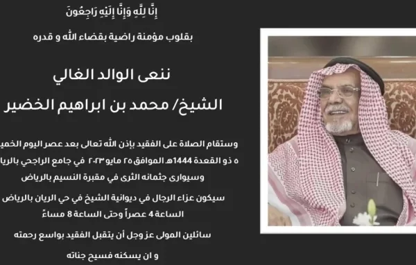 الوالد الشيخ / محمد بن ابراهيم الخضير في ذمة اللهالإدارةنومبر 21, 2024الوالد الشيخ / محمد بن ابراهيم الخضير في ذمة الله ... اقرأ المزيد
